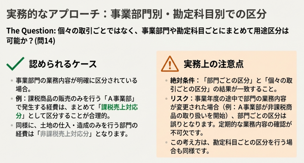 例外的に、事業部門ごとや勘定科目ごとに一括で区分することも認められる場合があります。ただし、これはその部門が課税売上しか行わない(例:商品販売部門)など、業務内容が明確に分離されており、結果として取引ごとに区分した場合と完全に一致する場合に限られます。年度の途中で業務内容が変わるなどして実態と乖離した場合は誤った申告となるため、適用には細心の注意が必要です(問14)。