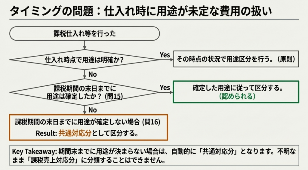 では、課税期間の末日になっても用途が未定の場合はどうなるのでしょうか。この場合、その課税仕入れ等は、課税売上対応分にも非課税売上対応分にも区分できないため、「共通対応分」として処理しなければならない、というのが確定的なルールです(問16)。決して「おそらく課税売上に使うだろう」といった推測で課税売上対応分に分類してはいけません。