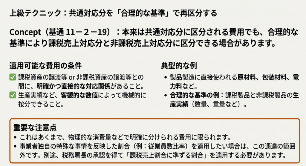 この特例が適用できるのは、課税売上と非課税売上の双方との対応関係が明確かつ直接的であり、客観的な数値(生産実績など)に基づいて機械的にあん分できる費用に限られます(問20)。