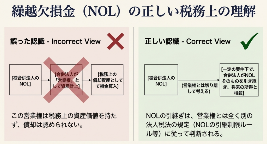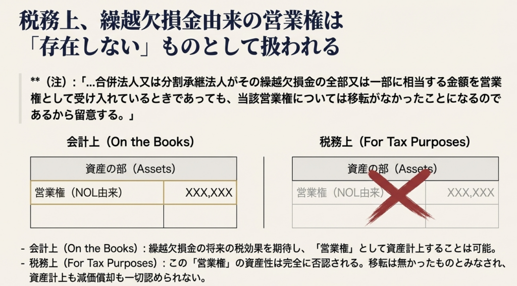 特定の税務属性である繰越欠損金を、営業権という一般的な資産に変換して、厳格な承継ルールを潜脱することは認めない、という税法の固い意思の表れなのです。したがって、たとえ会計帳簿に営業権が計上されていても、税務上はそのような資産の移転は最初からなかったものとして扱われます。