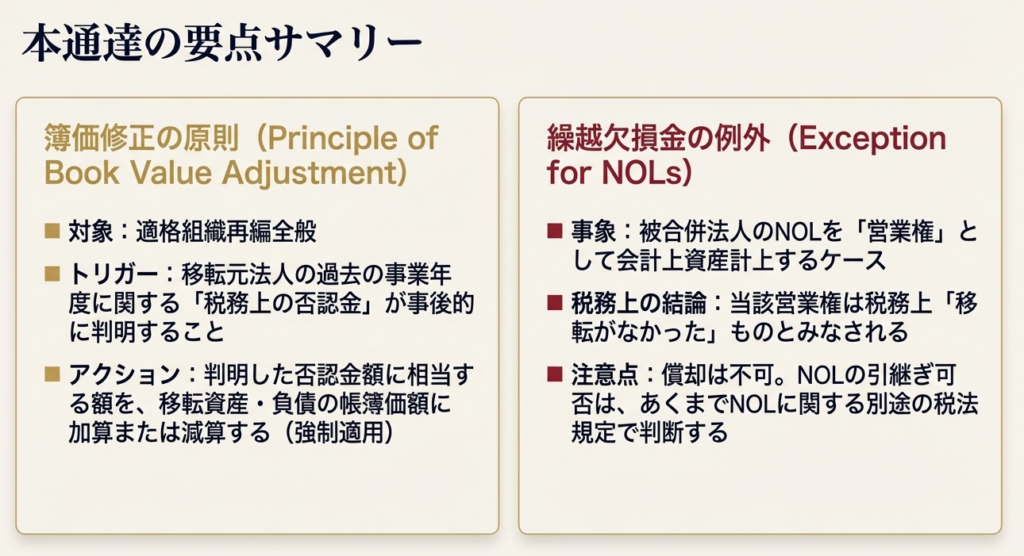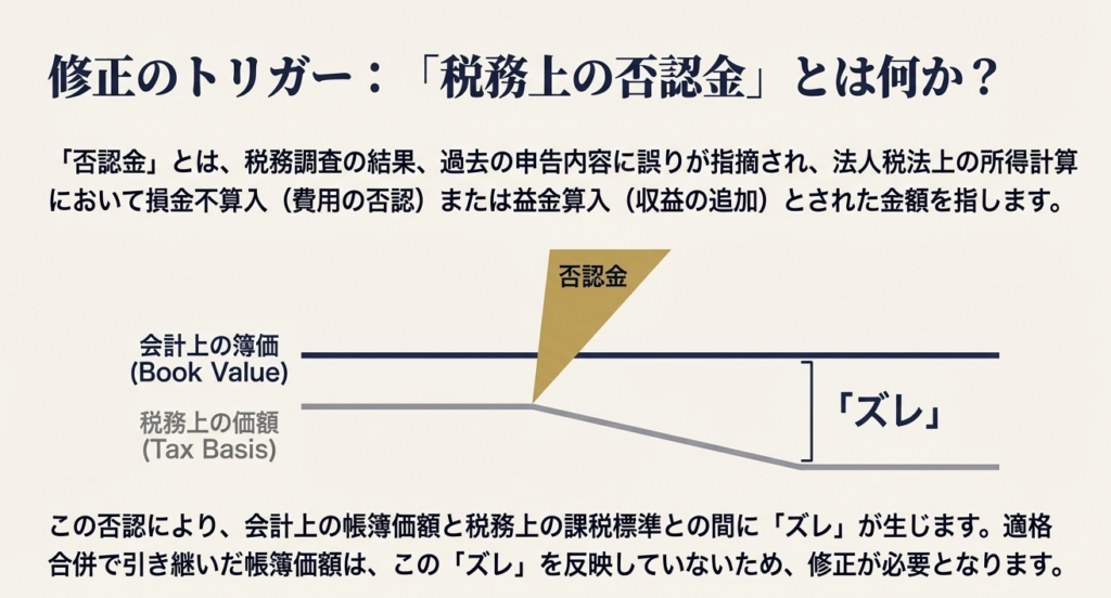 これは、適格再編成において繰り越された帳簿価額が、後から判明した過去の税務上の誤り(否認金)を反映して、適正な税務上の状態に調整されることを意味します 。