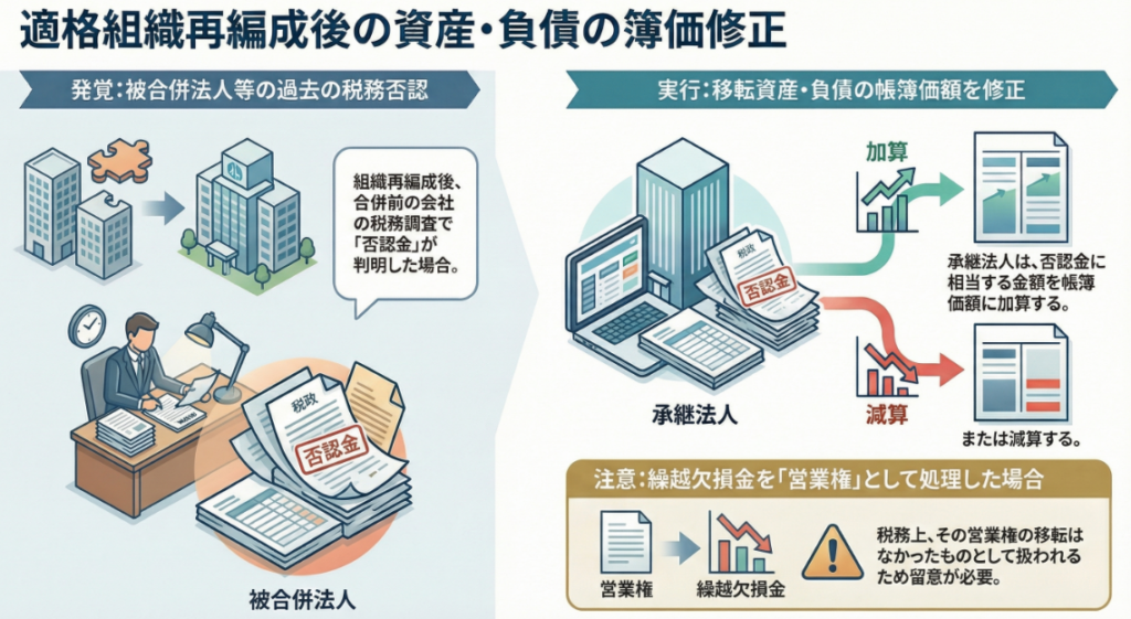 適格組織再編成が完了した後、再編成前の会社(被合併法人など)の過去の事業年度に対して税務調査が行われ、申告誤り(否認金)が発見された場合、再編成後の会社(合併法人など)は、引き継いだ資産・負債の帳簿価額をその否認金の額だけ修正する義務があります。
