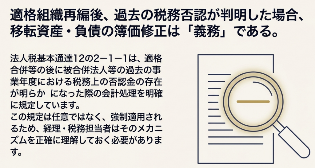 この規定の目的は、適格組織再編成において引き継がれる資産・負債の税務上の価額を、再編成前の法人の過去の税務上の状態と整合させることにあります。再編成後に過去の否認が発覚した場合でも、引き継ぎ時点の簿価を正しく修正することで、税務上の一貫性を確保します。