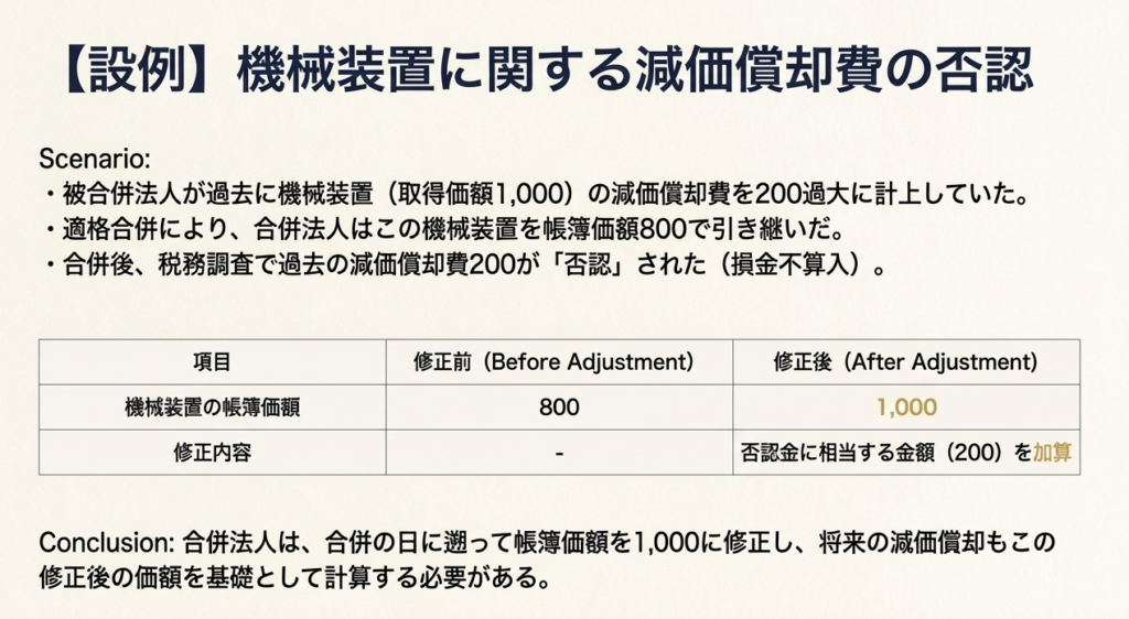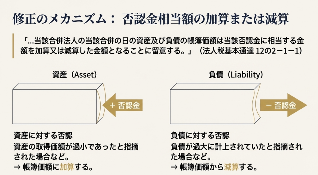 合併法人は、判明した否認金に相当する金額を、合併日における資産および負債の帳簿価額に加算または減算して修正します。これにより、税務上の正しい価額に帳簿価額を一致させます。
