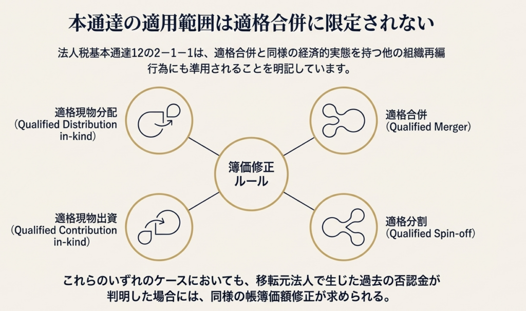 この簿価修正のルールは、適格合併だけに限定されるものではありません。通達の第二文では、以下の組織再編成についても同様の処理が求められることを明確にしています。