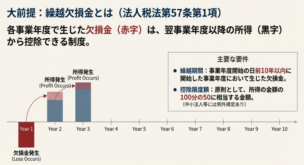 そもそも法人税法では、企業が過去10年以内に開始した事業年度で生じた欠損金(赤字)は、その後の事業年度で得た利益(所得)と相殺し、法人税の負担を軽減することが認められています(法人税法第57条第1項)。これが繰越欠損金の基本ルールです。本稿で解説するのは、合併という特別な組織再編において、この価値ある権利がどのように扱われるか、という極めて重要な論点です。