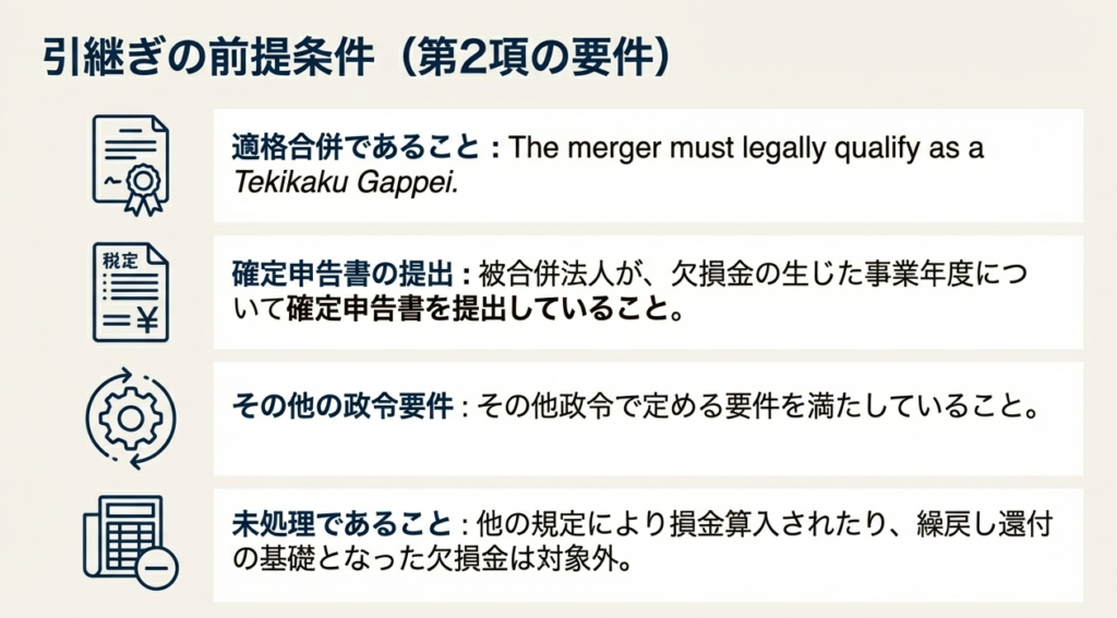 ただし、この引継ぎが認められるためには、いくつかの形式的な要件も満たす必要があります。まず被合併法人が、欠損金が生じた事業年度について確定申告書を提出していることなど、政令で定める要件を満たす必要があります(第57条第2項)。加えて、欠損金を引き継いだ合併法人側も、その計算の根拠となる帳簿書類を適切に保存し、かつ連続して確定申告書を提出し続けなければ、引き継いだ欠損金を利用することはできません(第57条第10項)。