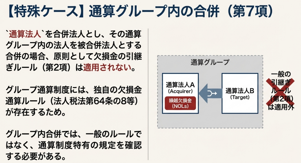 法人税法第57条第7項では、通算制度を適用しているグループ内の法人同士が合併する場合、一定の条件下においては、これまで見てきた第2項に定められた欠損金の引継ぎ規定そのものが「適用されない」と定めています。