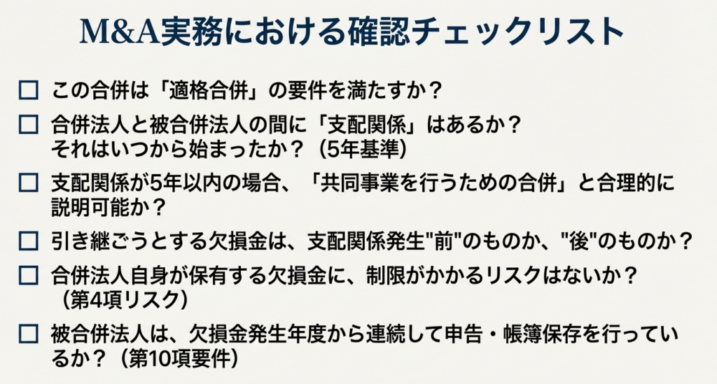 本稿で解説したように、合併における繰越欠損金の引継ぎルールは非常に複雑です。実務担当者の皆様が合併案件に関与する際には、以下の実践的な注意点を最低限押さえておく必要があります。