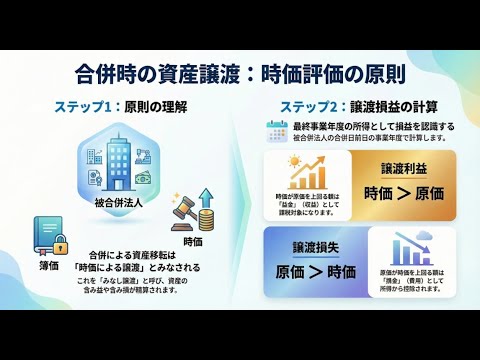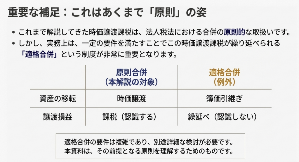今回解説した内容は、合併における税務の最も基本的な「原則」です。実際の組織再編は非常に複雑であり、一定の要件を満たす場合には、この時価評価課税が繰り延べられる例外規定(例えば「適格合併」)も存在します。しかし、どのような複雑な案件であっても、まずはこの「原則は時価譲渡課税である」という基本に立ち返って考えることが、正しい理解への近道となります。