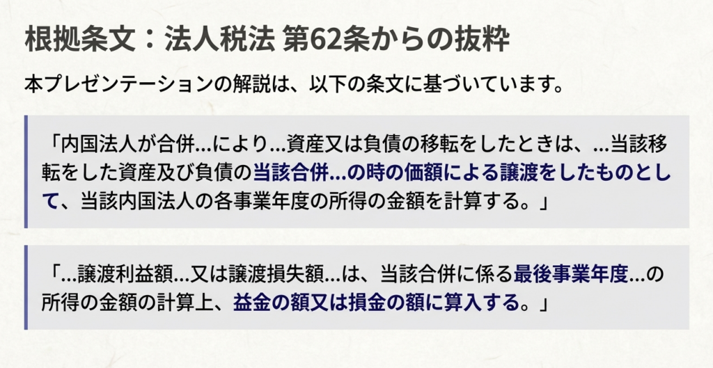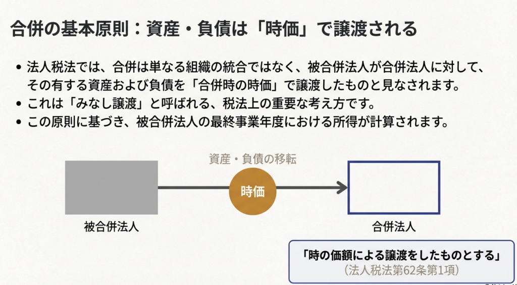 解説:法人税法第62条に基づく合併時の資産譲渡の原則について