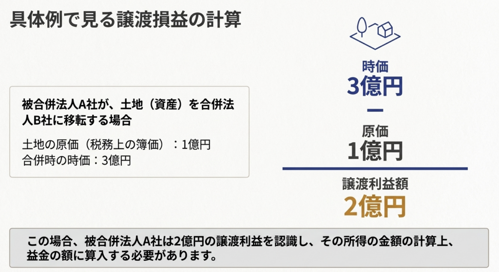 上記の価額(時価)と、資産・負債の税務上の帳簿価額(原価)との差額が「譲渡利益額」または「譲渡損失額」として計算されます。これにより、それまで帳簿上に現れていなかった含み益や含み損を実現させ、被合併法人の最後の事業年度の所得として認識(益金または損金に算入)します。