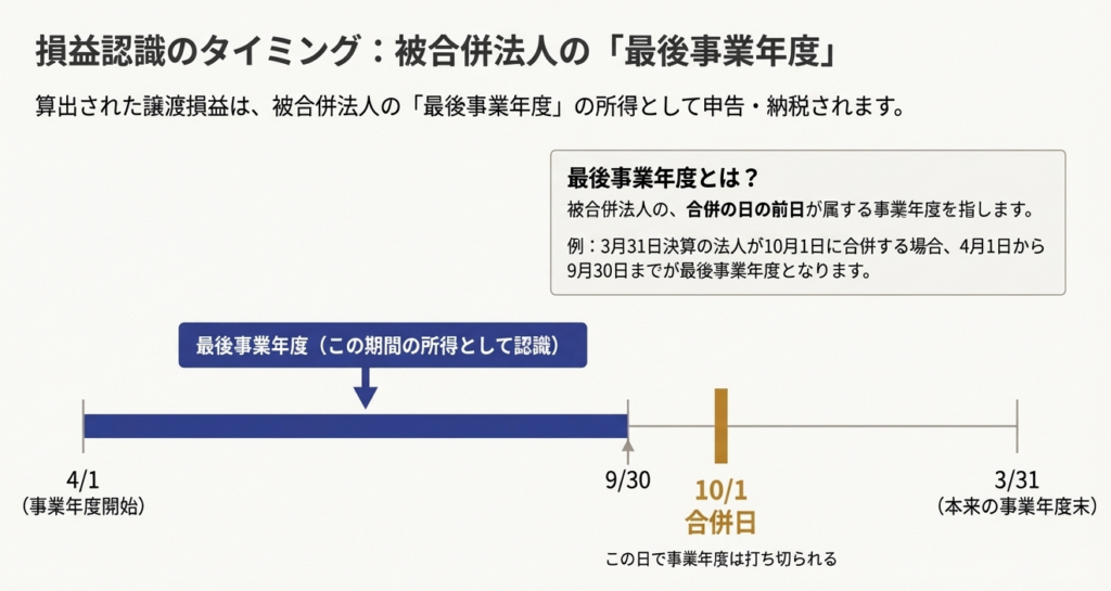 ここでの重要なポイントは、譲渡損益が算入されるのが「被合併法人の最後事業年度」であるという点です。