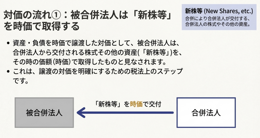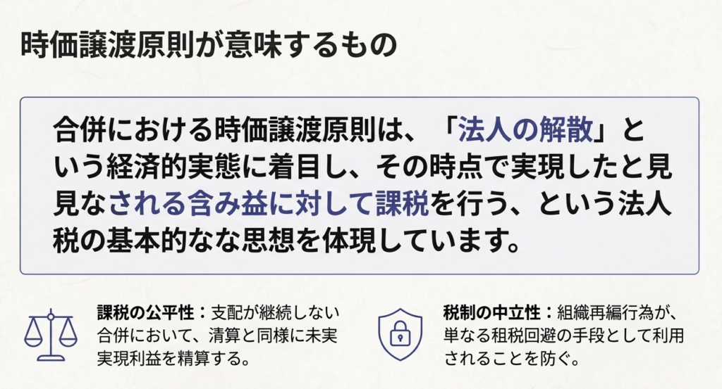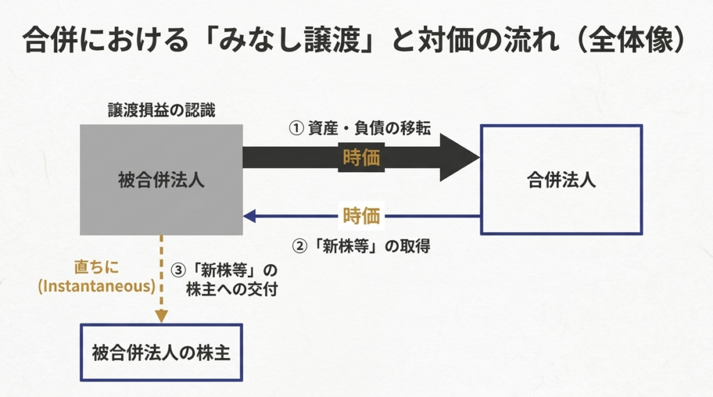 これは、合併時における資産・負債の移転が、税務上は「時価による譲渡」とみなされることを定めた規定です。たとえ当事者間で売買契約を結んでいなくても、法律上、時価で売却したと「みなす」ことから、これを「みなし譲渡」と呼びます。この規定により、含み益のある資産を保有していた被合併法人は、合併のタイミングでその含み益を実現させ、課税対象所得として認識する必要が生じます。