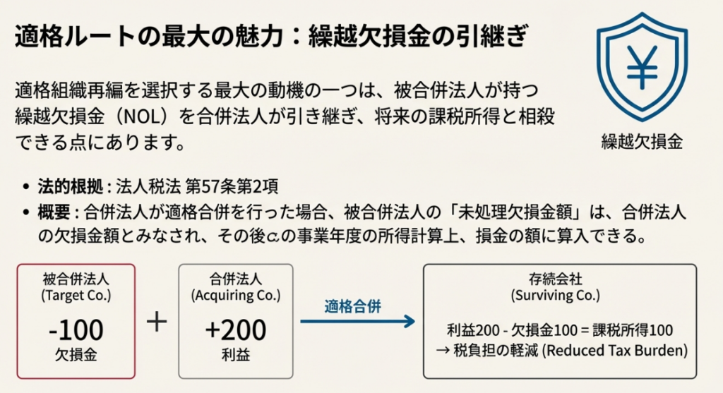 適格合併がもたらす税務上のメリットの中で、実務上、最も重要視される論点の一つが繰越欠損金の引継ぎです。