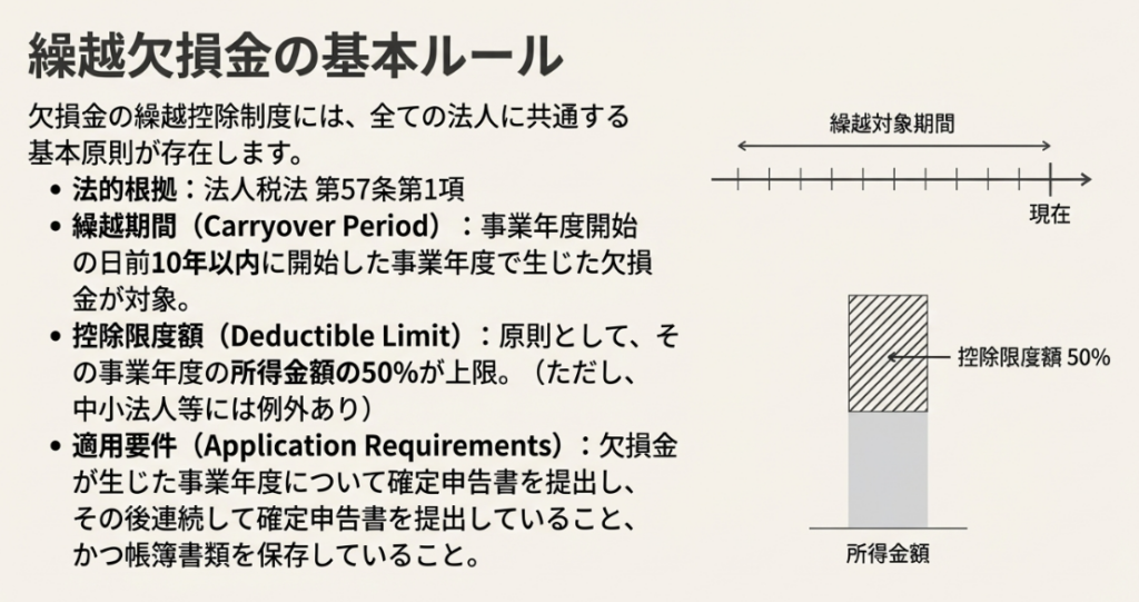 3. 法人税法第57条における欠損金の繰越控除の基本的なルール(繰越期間と対象)について説明してください。