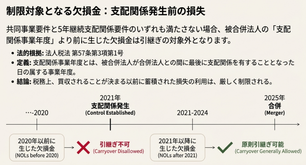 平易に言えば、支配関係が生まれる前の事業年度に生じた欠損金は、原則として引継ぎの対象外となります。これは、赤字企業が持つ繰越欠損金の利用のみを目的とした、租税回避的な合併(いわゆる「欠損金買い」)を防止するための規定です。