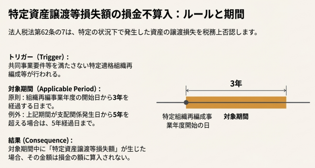 繰越欠損金の引継ぎ制限に加え、もう一つ知っておくべき重要な租税回避防止規定があります。それが「特定資産譲渡等損失の損金不算入」です。