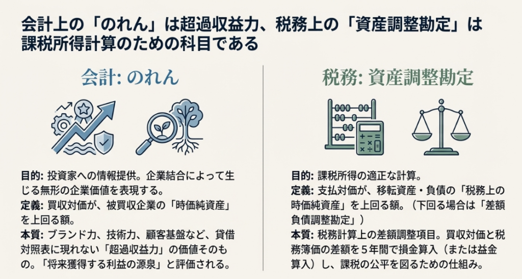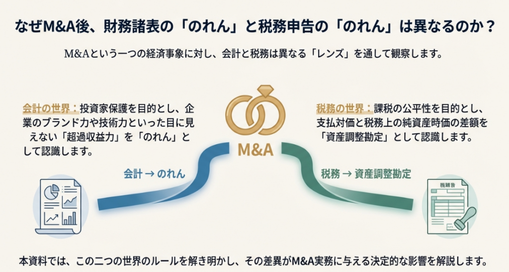 M&A(企業の合併・買収)という一つの経済取引は、財務諸表を作成する「会計」の世界と、税金を計算する「税務」の世界で、異なる顔を見せます。その最も代表的な例が、買収によって生じる「のれん」の扱いです。会計上は「のれん」として資産計上され、企業の将来の収益力を示す一方、税務上は特定の条件下でのみ「資産調整勘定」として認識され、課税所得の計算に影響を与えます。