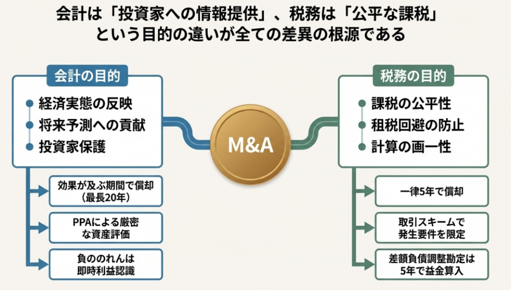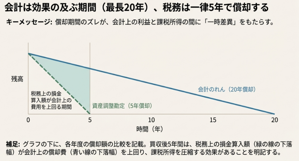 会計は、企業買収の効果が及ぶ期間にわたって費用を適切に配分し、投資家に情報提供することを目的としています。一方、税務は課税の公平と早期安定化を目的とし、価値評価が不確実なのれん相当額を比較的短期間(5年)で費用化(または収益化)させるルールを設けているため、両者の期間に違いが生じます。