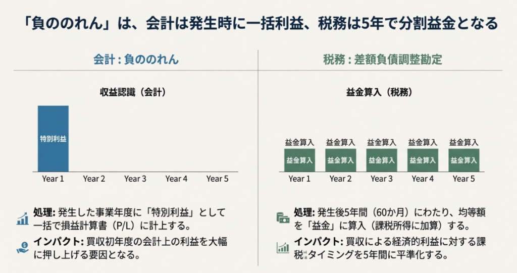 会計上の「負ののれん」は、発生した事業年度に一時的な利益として即時認識されます。それに対して、税務上の「差額負債調整勘定」(負ののれんに相当)は、5年間にわたって均等に益金に算入され、徐々に課税所得に加算されます。