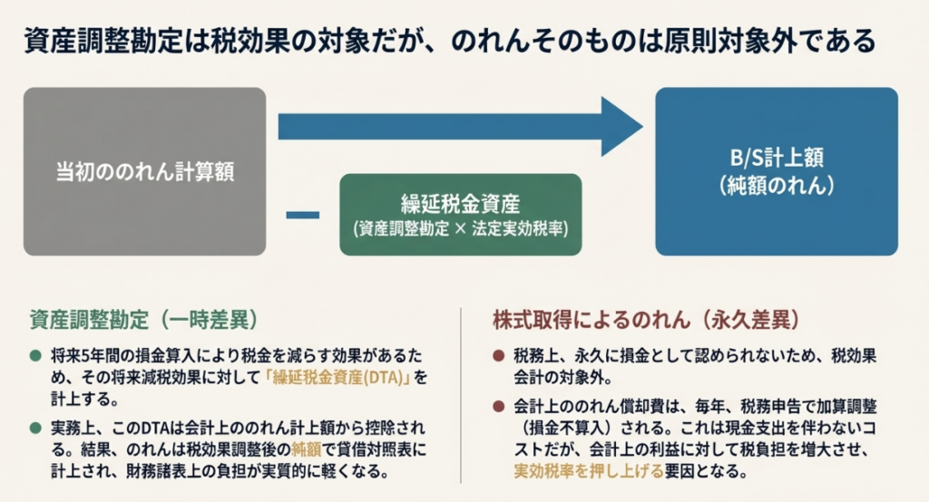 資産調整勘定は、典型的な一時差異を生み出します。なぜなら、計上された金額は将来5年間で必ず税務上の損金となることが確定しているからです。この「将来の税金を減らす効果」を資産として認識するため、買収時に繰延税金資産(DTA)を計上します。そして、会計上ののれん計上額は、この繰延税金資産の分だけ直接減額されます。