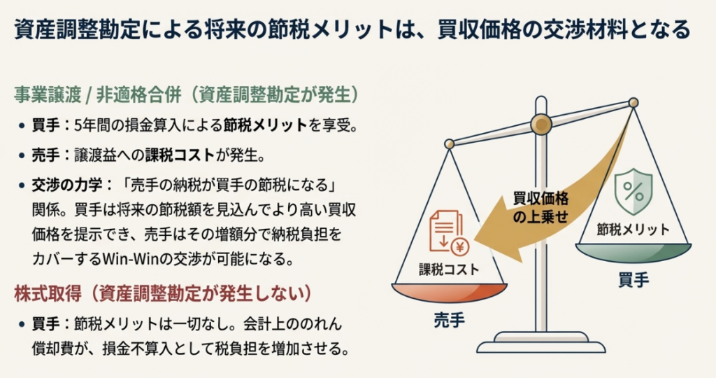 株式取得を選ぶか、事業譲渡を選ぶかによって、税務上の帰結は全く異なります。特に事業譲渡等で「資産調整勘定」を発生させられれば、買手は買収後5年間にわたり税務上の損金を得られ、大きな節税効果(タックス・シールド)を享受できます。この将来の税務メリットは、買収価格の交渉における極めて重要な要素です。「売手の納税が買手の節税になる」という関係性から、買手は将来の節税効果を見込んでより高い買収価格を提示し、売手はその増額分で自らの納税負担を補う、といった戦略的な交渉が行われるのです。
