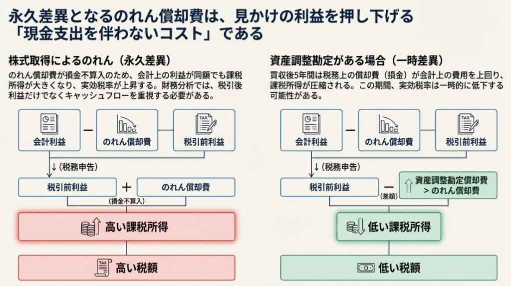 株式取得で生じたのれんのように、その償却費が税務上損金にならない(永久差異)場合、注意が必要です。この償却費は会計上の利益を減少させますが、税金の支払額は減らしません。結果として、会社の「実効税率(会計上の利益に対する税負担の割合)」が見かけ上、高くなる要因となります。
