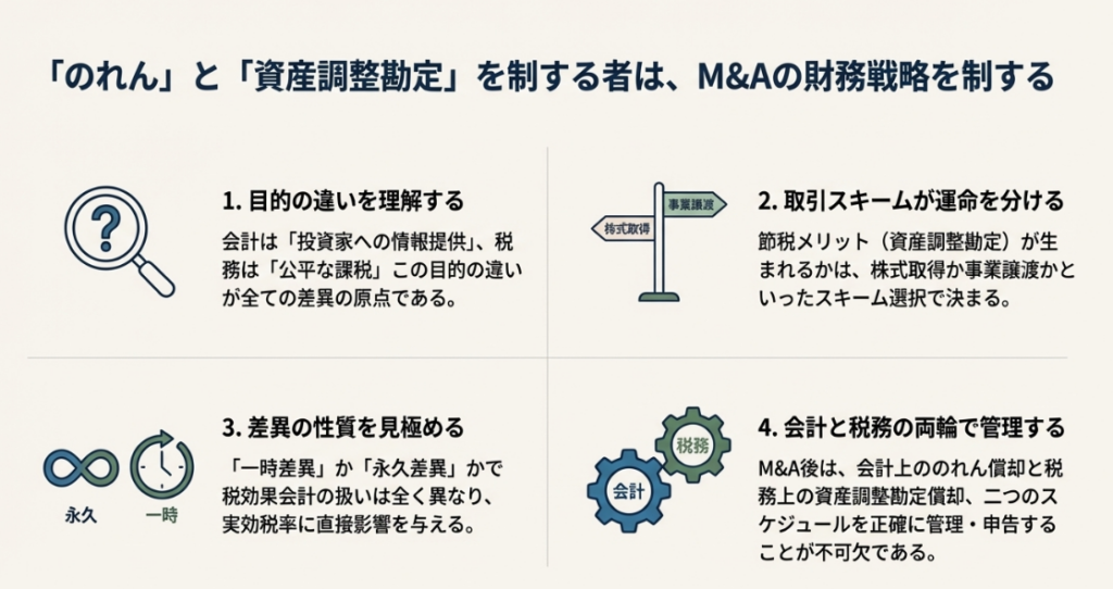 これまで見てきた会計と税務の複雑な関係性は、M&Aの意思決定やその後の経営管理に直接的な影響を及ぼします。実務担当者として、以下の4つのポイントはコストの高いエラーを避け、戦略的な価値を付加するための鉄則として必ず押さえておきましょう。