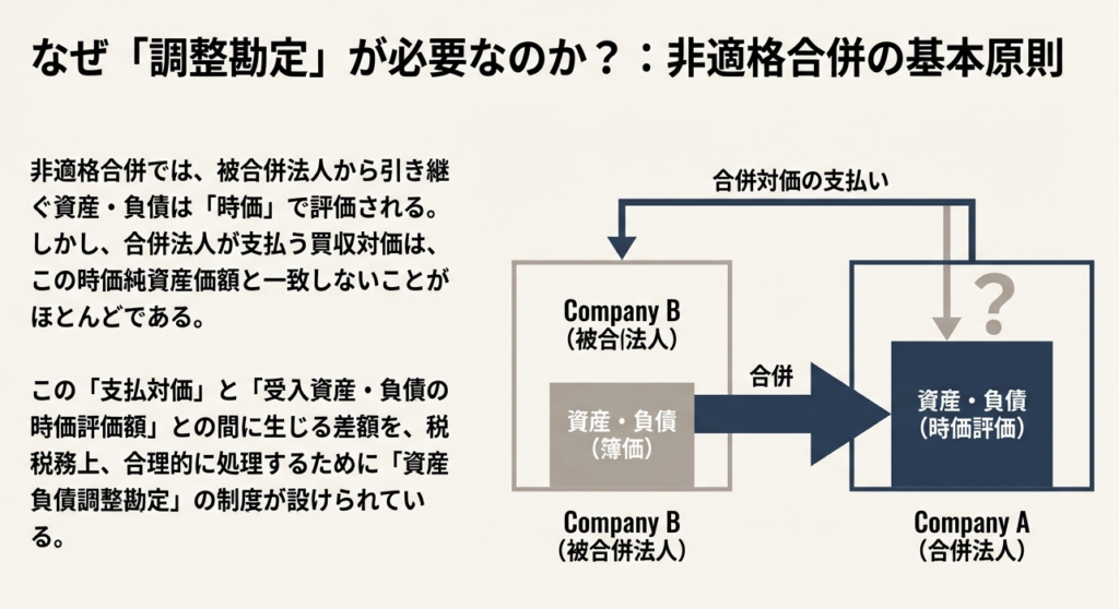 この記事は、当事務所の新人スタッフやクライアント企業の経理担当者の皆様が、非適格合併における重要な税務論点である調整勘定の基本をしっかりと理解し、実務に活かせるようになることを目的としています。