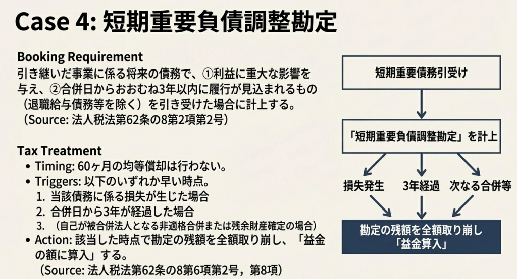 負債調整勘定には、差額負債調整勘定のほかに、引き継いだ従業員に係る退職給与債務引受額や、おおむね3年以内に履行が見込まれる短期重要債務見込額も含まれます。これらの負債調整勘定も、債務の履行や損失の発生、または3年の経過など特定の事由が生じた際に減額され、益金算入されます。
