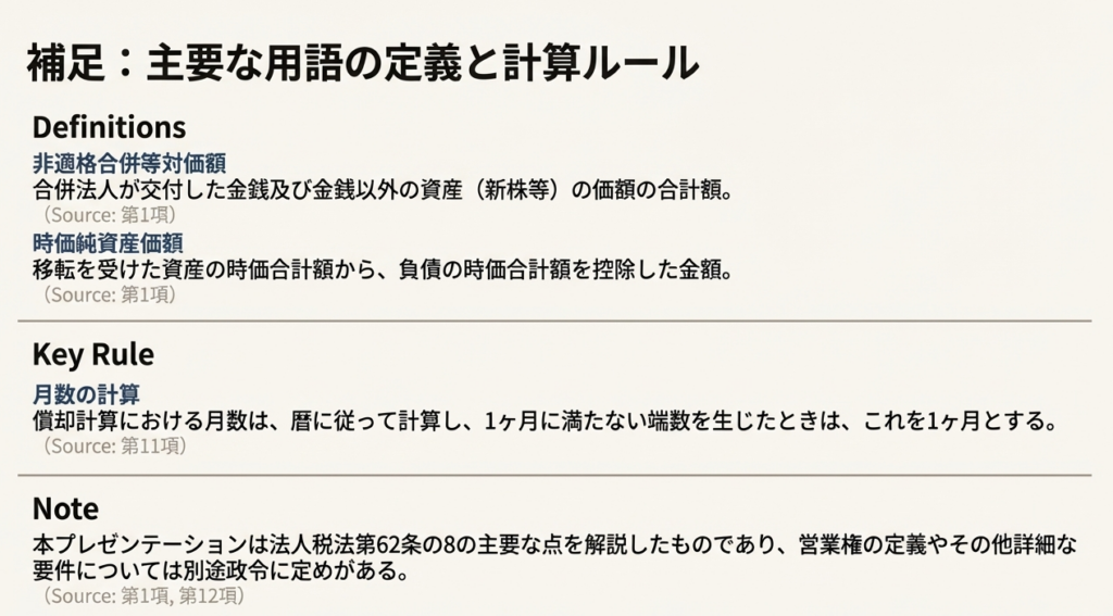 第62条の8(非適格合併等により移転を受ける資産等に係る調整勘定の損金算入等)をもとに合併に関する規定を解説します。
