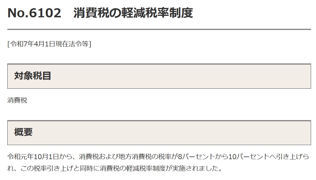 国税庁タックスアンサーの「No.6102 消費税の軽減税率制度」について解説します。