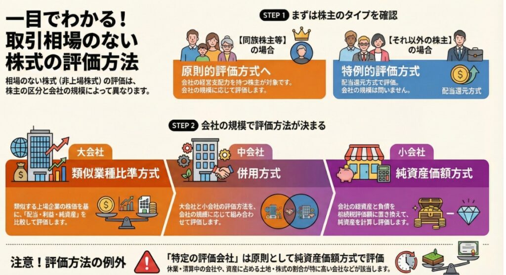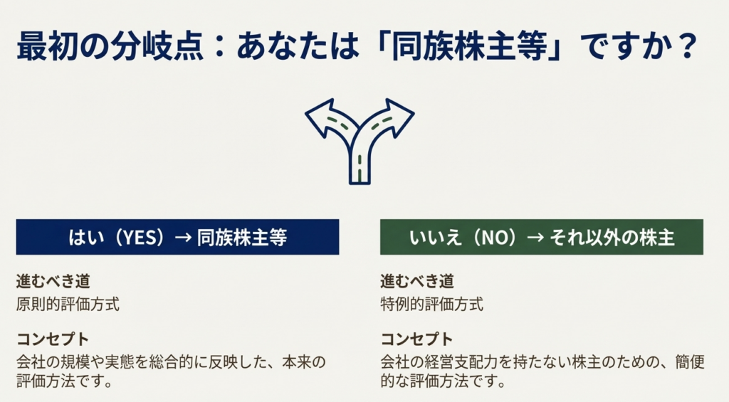 株主がその会社の経営支配力を持つ「同族株主等」か、それ以外の株主かによって評価方式が区別されます。同族株主等には原則的評価方式が、それ以外の株主には特例的な評価方式(配当還元方式)が原則として適用されます。