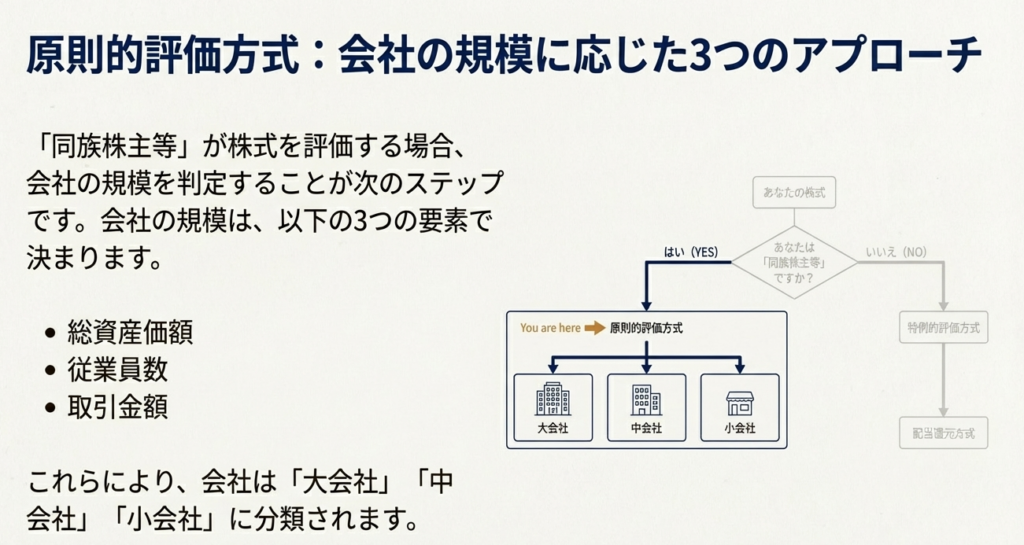 原則的評価方式は、会社の経営を支配する力を持つ同族株主等が株式を取得することを想定し、会社の価値を多角的に評価する方法です。この方式を適用する前提として、まず評価対象の会社をその規模に応じて「大会社」「中会社」「小会社」のいずれかに区分する必要があります。