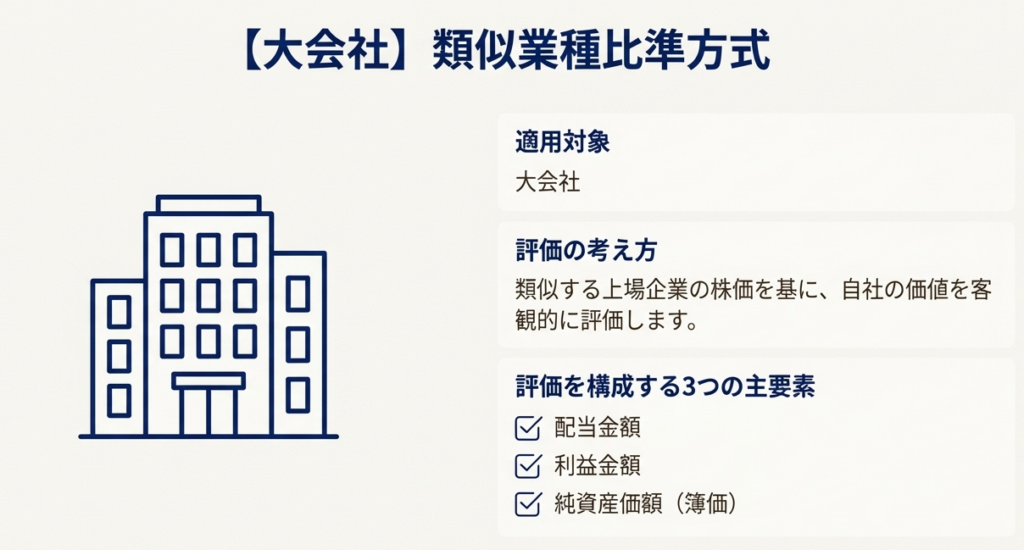 大会社は、原則として「類似業種比準方式」により評価されます。この方式は、事業内容が類似する上場企業の株価を基準に、評価対象会社の「配当金額」「利益金額」「純資産価額(簿価)」の3つの要素を比較して株価を算出する方法です。