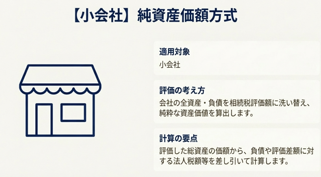 小会社は、原則として「純資産価額方式」によって評価されます。この方式では、会社の総資産と負債を相続税評価額に洗い替え、評価後の総資産価額から負債や法人税額等相当額を差し引いた純資産額に基づいて株価を評価します。
