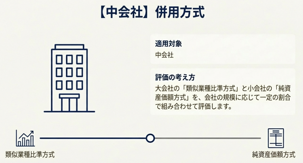 中会社は、大会社の評価方法である類似業種比準方式と、小会社の評価方法である純資産価額方式を併用して評価されます。両方式の適用割合は会社の規模に応じて決定されます。