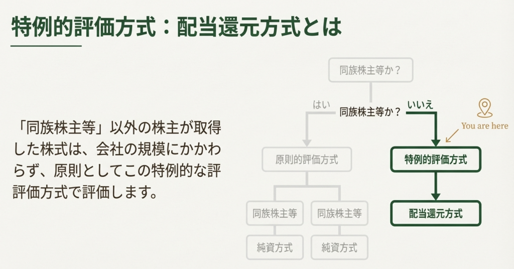 配当還元方式は、同族株主以外の株主が取得した株式の評価に原則として用いられます。この場合、株式を発行した会社の規模(大会社、中会社、小会社)は問われません。