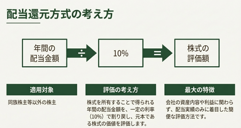 配当還元方式株式を所有することで受け取る1年間の配当金額を、一定の利率(10%)で還元して元本である株式の価額を評価する方法。