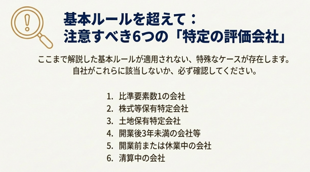 会社の規模による区分とは別に、その財産構成や経営状況が著しく特殊な会社については、「特定の評価会社」として特別な評価方法が定められています。これらの会社に該当する場合、たとえ大会社であっても原則として純資産価額方式で評価するなど、通常とは異なるルールが適用されるため注意が必要です。