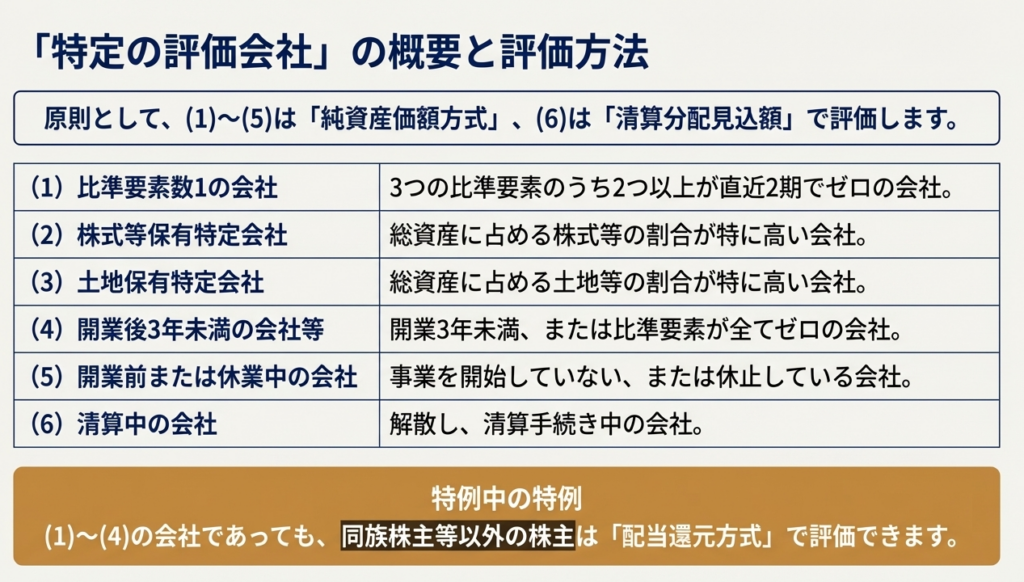 「特定の評価会社」の例として、(1)比準要素のうち2つ以上がゼロである会社、(2)株式等の保有割合が非常に高い「株式等保有特定会社」、(3)土地等の保有割合が非常に高い「土地保有特定会社」が挙げられます。その他、開業後3年未満の会社や休業中の会社も含まれます。