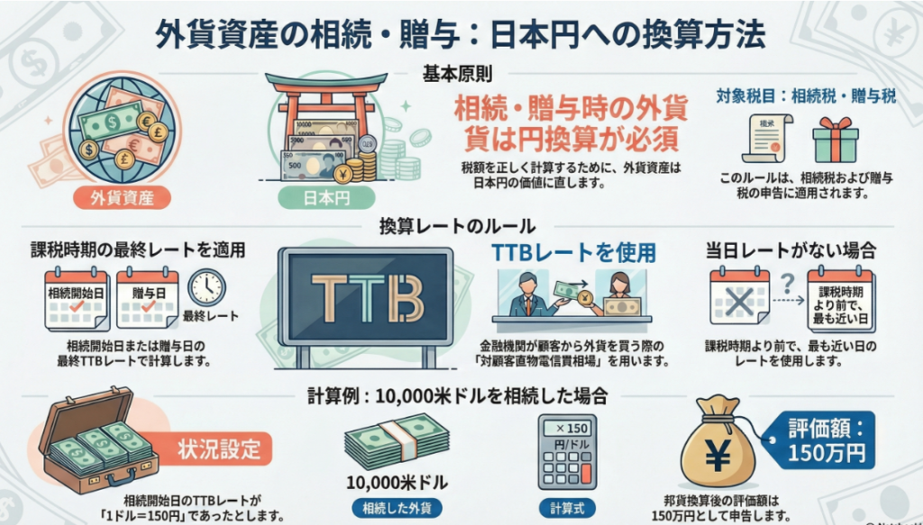 具体的には、課税時期(相続または遺贈の場合は被相続人の死亡の日、贈与の場合は財産を取得した日)における**最終の対顧客直物電信買相場(TTB)**またはこれに準ずる相場が適用されます。TTBとは、金融機関が顧客から外貨を買い、邦貨を支払う場合(顧客側が外貨を邦貨に交換する場合)の相場です。