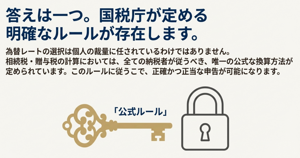 実務においては、まず結論となる基本ルールを正確に把握することが何よりも重要です。複雑な詳細に入る前に、相続税・贈与税申告における外貨(現金)評価の最も核心的なルールをここで明確に提示します。