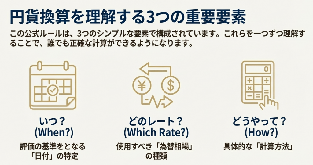 この2つのポイントさえ押さえておけば、外貨評価の基本は理解できたと言えます。この基本ルールには「課税時期」や「TTB」といった重要なキーワードが含まれています。次の章で、これらの詳細を一つずつ丁寧に解説していきます。