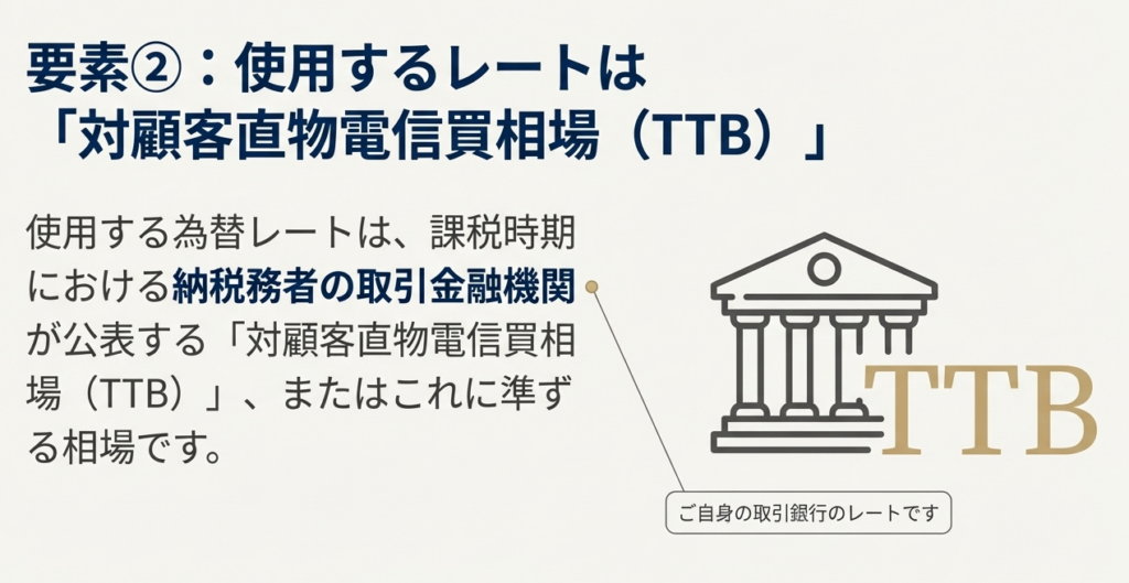 評価に用いる為替レートは、納税義務者の「取引金融機関」「対顧客直物電信買相場(TTB)」またはそれに準ずる相場を使用します(実務上は、ほぼ全てのケースでTTBが適用されます)。