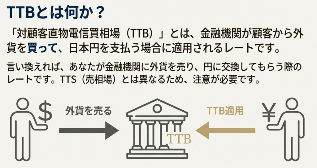 次に、使用する為替レートである「対顧客直物電信買相場(TTB)」について解説します。TTBとは、国税庁の定義によれば「金融機関が顧客から外貨を買って邦貨を支払う場合の相場」を指します。