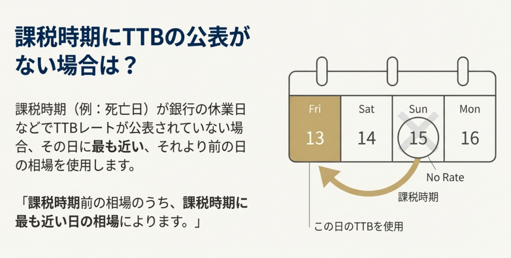 例えば、課税時期が日曜日であった場合、その直前の金曜日に公表されたTTBレートを使用します。ここで絶対に間違えてはならないのは、決して課税時期「後」の日付(例:翌月曜日)のレートは使用できないという点です。必ず「前」に遡って最も近い日のレートを探してください。