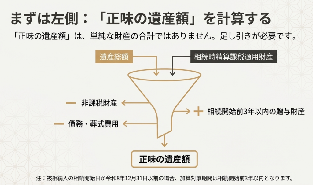 | 正味の遺産額 | 遺産総額と相続時精算課税適用財産の合計額から、非課税財産、葬式費用、債務を控除し、加算対象の贈与財産を加えたもの。 |