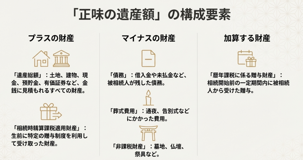 次に、基礎控除額と比較する対象となる「正味の遺産額」を算出します。これは、単純にプラスの財産を合計したものではありません。以下の要素をそれぞれ加算・控除して計算します。